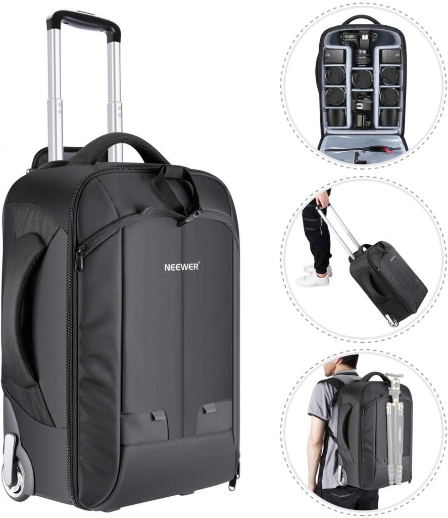 A little more heavy-duty for camera operation is the Neewer 2-in-1 Convertible Wheeled Camera Backpack. It has a luggage trolley case design with a double bar, anti-shock detachable padded compartment to hold essential items.