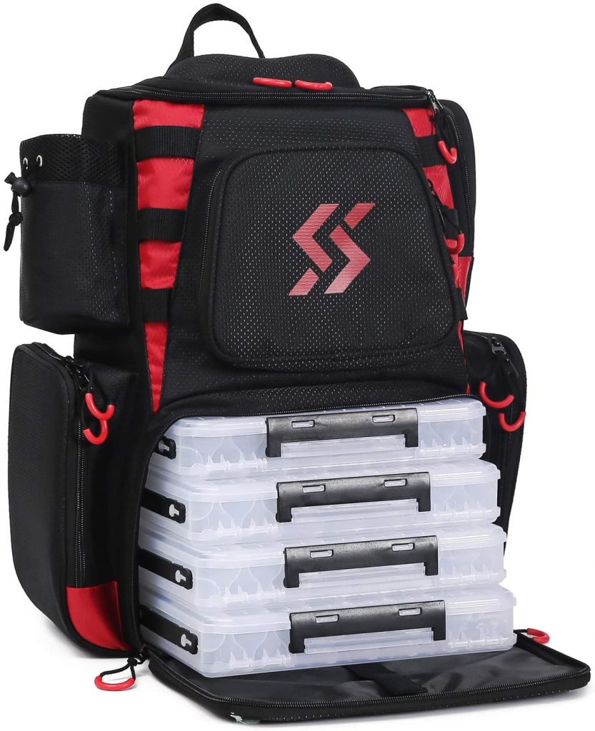 Sougayilang Fishing Tackle Waterproof Storage Bag Backpack has an adequate storage space with a removable divider, four zippered pockets, and two mesh pouches for extra storage. Overall, it is roomy with 4 trays and 80 compartments for ultimate user-experience during an adventure.